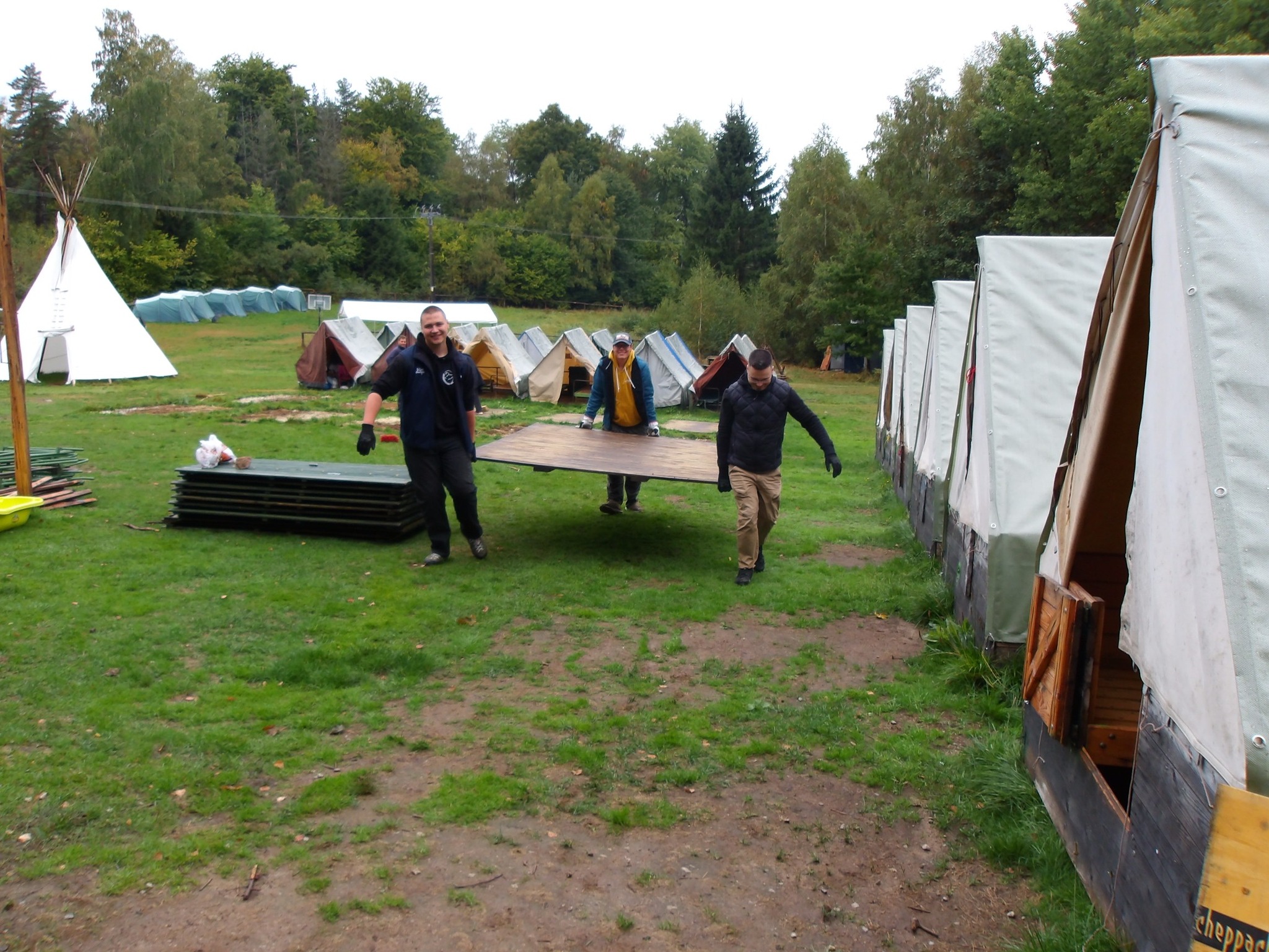 O druhém zářijovém víkendu se tak parta 17 vedoucích vydala ještě jednou do tábořiště na Zvůli, aby zde za pár dní zbourala to, co tak složitě a pracně na jaře postavila. Během dvou dnů bylo zbouráno: 26 stanů bez podsady, 12 malých podstadových stanů, 10 velkých podsadových stanů, 1 armádní stan, 1 herní stan. Přeneseno bylo celkem 750 stanových dílů o rozdílné velikosti i tvaru. Nachozeno bylo nespočet kroků. Celá ta práce ale všechny bavila a už teď se těšíme na další táborový rok….