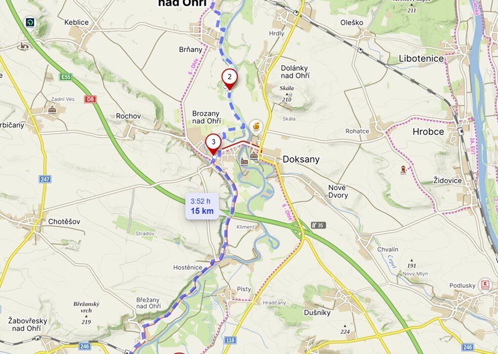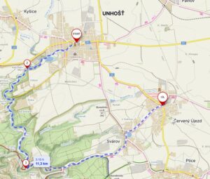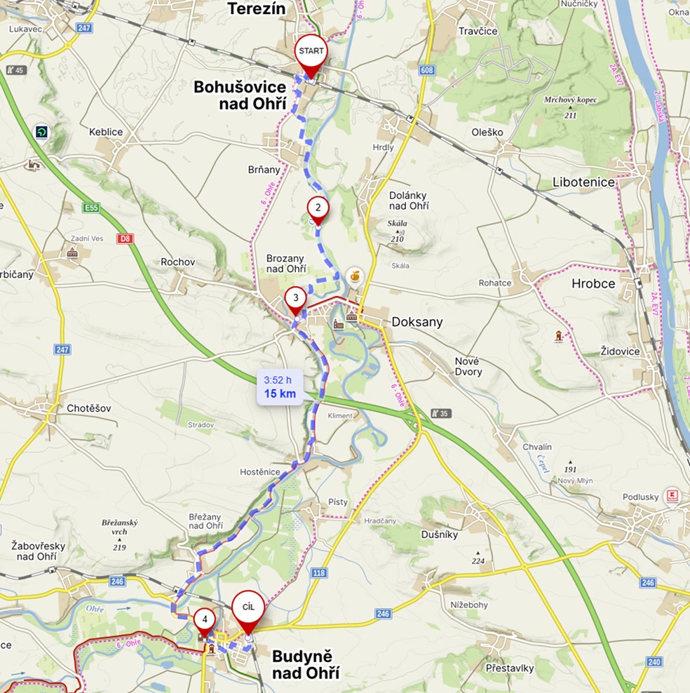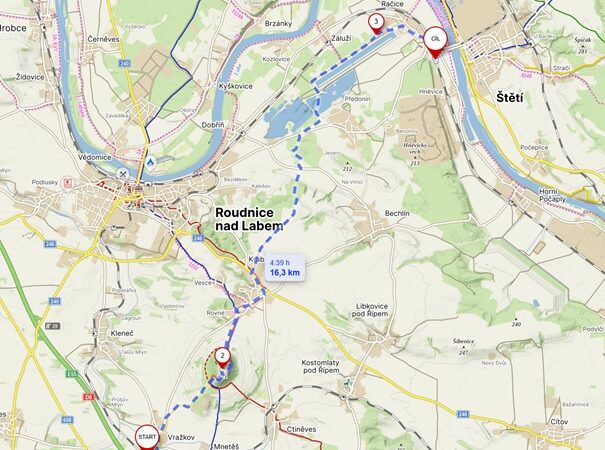 Z Vražkova nás čekala cesta do kopce na horu Říp. Po obhlédnutí nádherných výhledů a slavné rotundy, jsme se tentokráte vydali z kopce dolu do vesnice Rovné, kde na nás čekal zasloužený oběd. Odpolední putování směrem ke kanálu v Račicích muselo být bohužel zkráceno. Štěstí na počasí, které nás provázelo na všech výletech, nás tentokráte opustilo. Díky vytrvalému a někdy hodně vydatnému dešti, jsme byli nuceni zkrátit původní cestu o nějaký ten kilometr. I tak se nám povedlo ujít okolo 17 kilometrů, což vzhlede k počasí není vůbec špatný výkon.