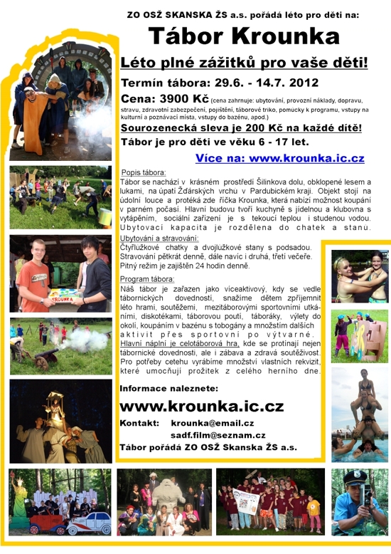 Poslední informace před odjezdem na tábor Odjezd z Prahy je 29.6. 2012 v 15.00 hod. Sraz je ve 14.30. Nekvasilova ulice - u hotelu Olympic, kousek od stanice metra Invalidovna. Na místě odevzdat (povinné): - bezinfekčnost s datem 29.6. 2012, kdo máte originál přihlášky, prosím také odevzdat! - kartičku pojištěnce (nejlépe okopírovaná) - Pokud vaše dítě/ti užívají léčiva, odevzdejte je zdravotnici, označte je jménem a dávkováním. Děti, které si samy hlídají léčiva, je také nutné nahlásit zdravotnici. - nechcete-li nechat (malým) dětem celý obnos kapesného, můžete jej předat v označené obálce jménem a částkou. Vedoucí jim vždy přidělí na výlet částku, tak, aby celý obnos neutratily na prvním výletě.